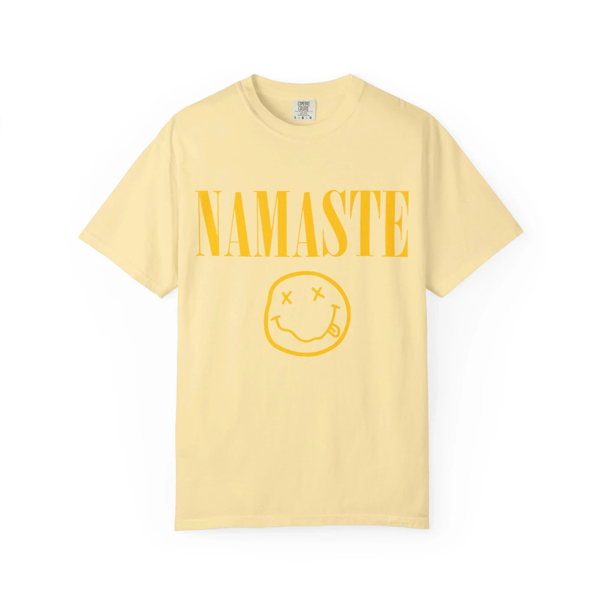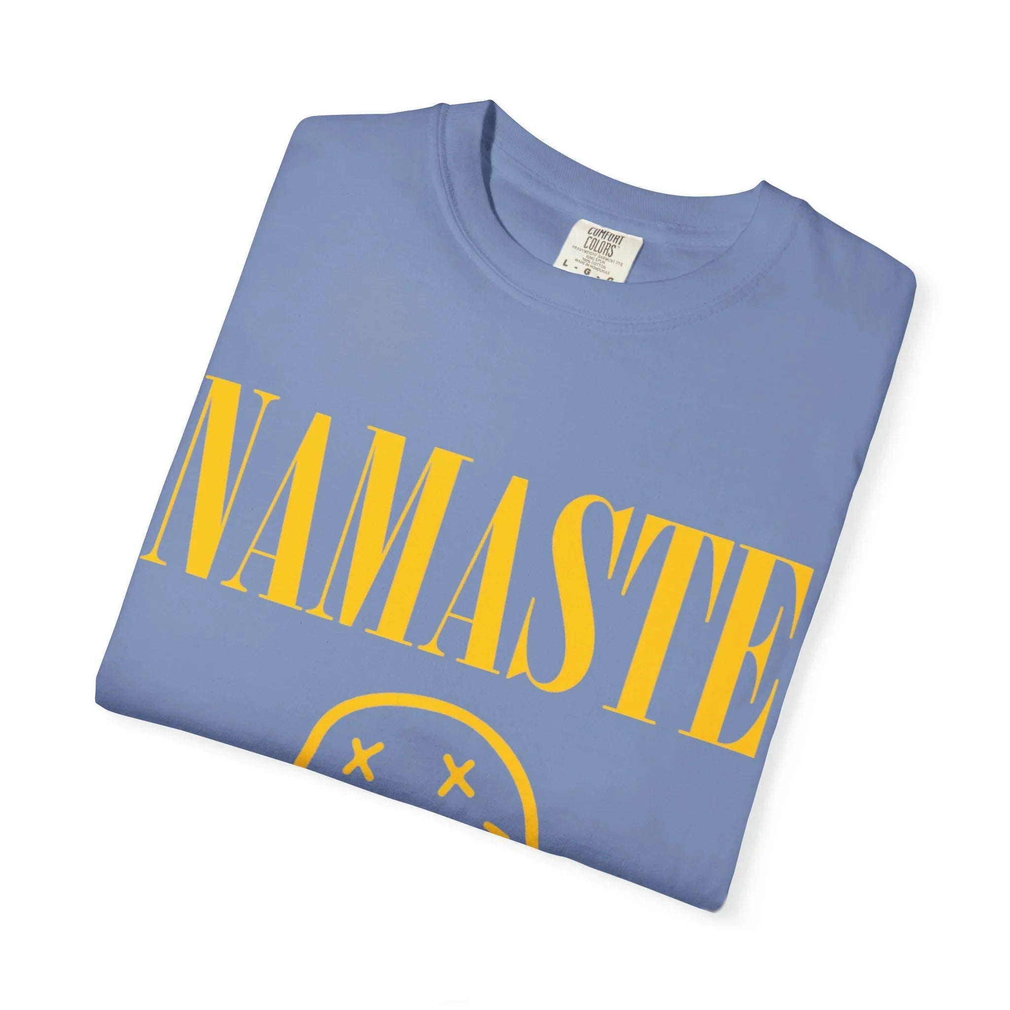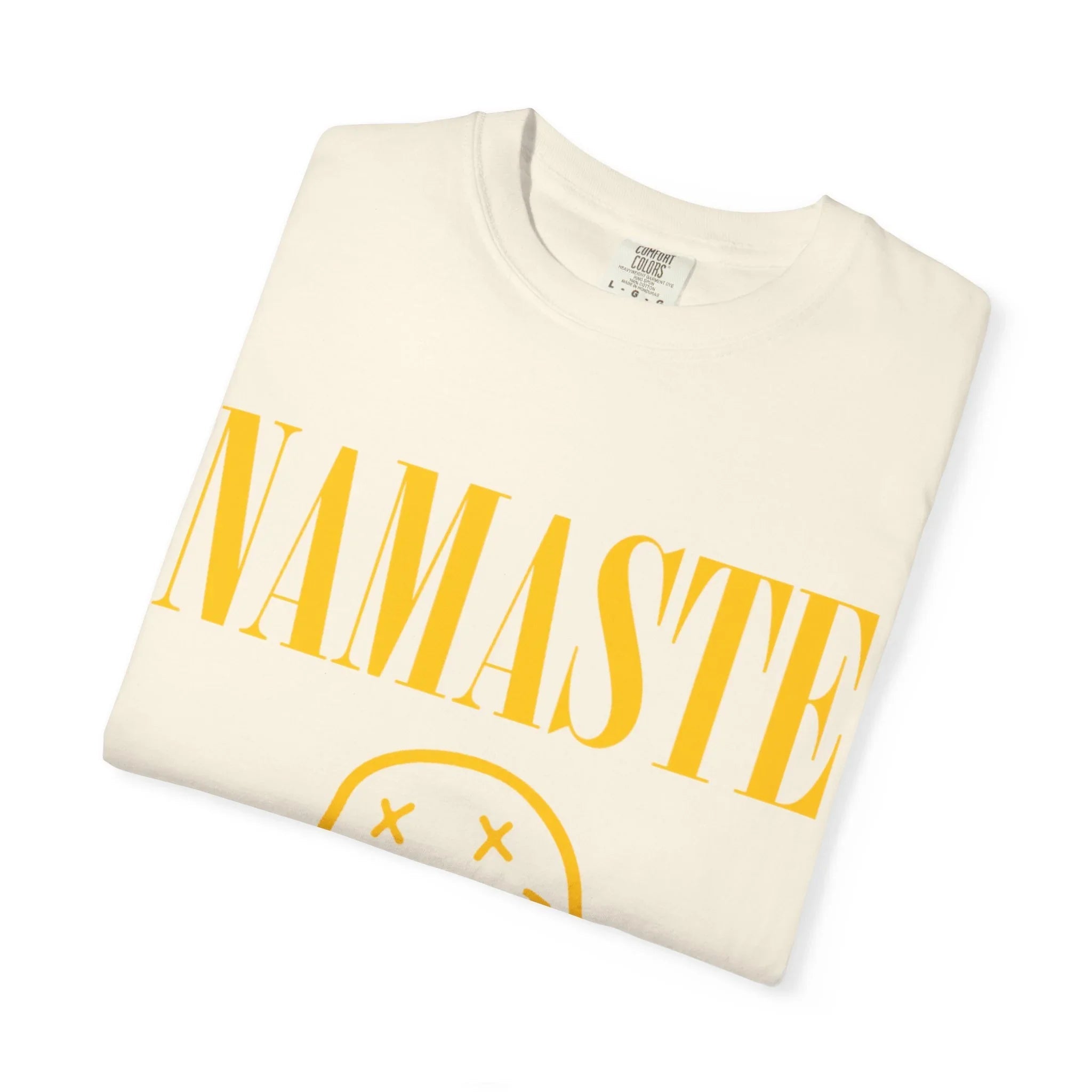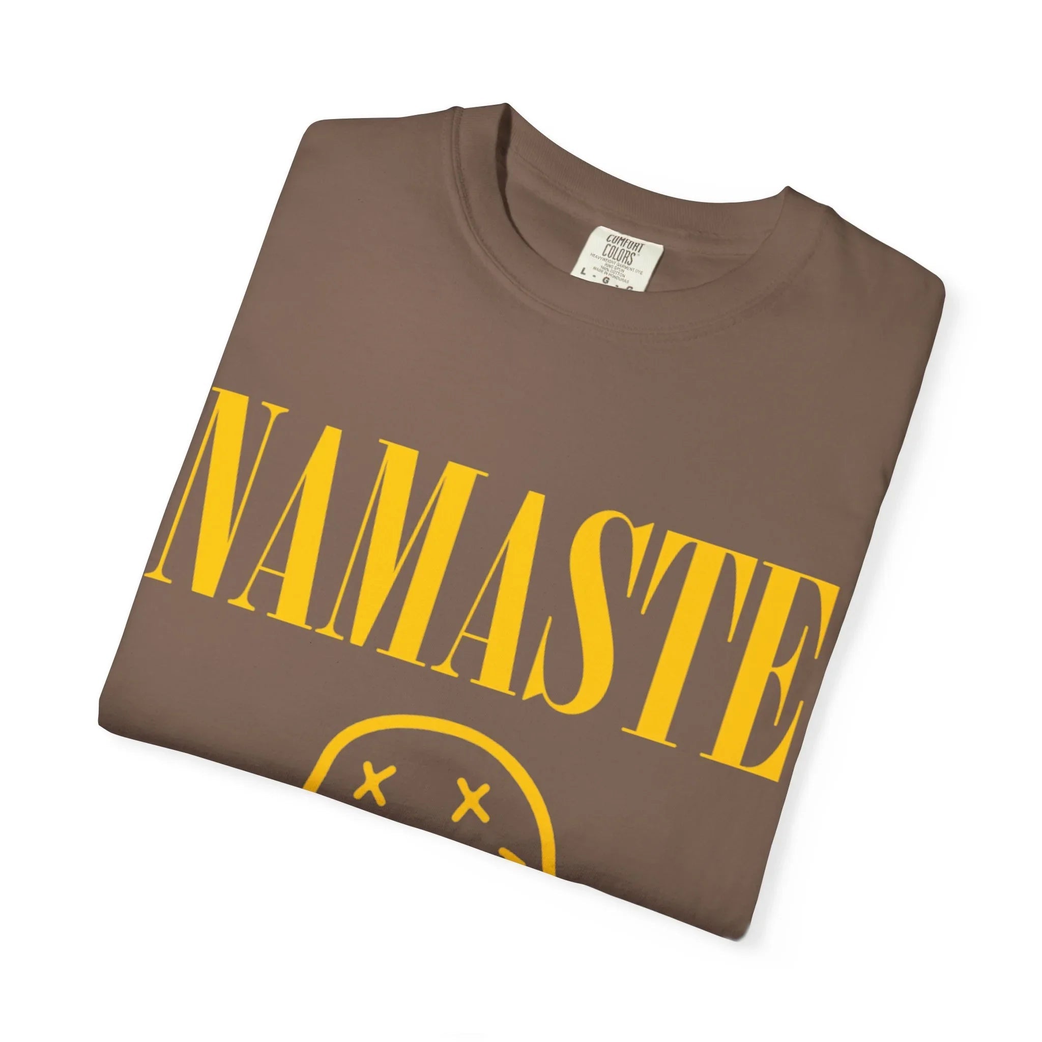 Inspired by timeless motifs, the “NAMASTE” thought meets the iconic spirit of the Grateful Dead in artful letterpress style on a soft, garment-dyed base. Whether you're flowing through sun salutations or crowd-surfing at a festival, this t shirt carries your energy with ease, comfort, and retro charm.