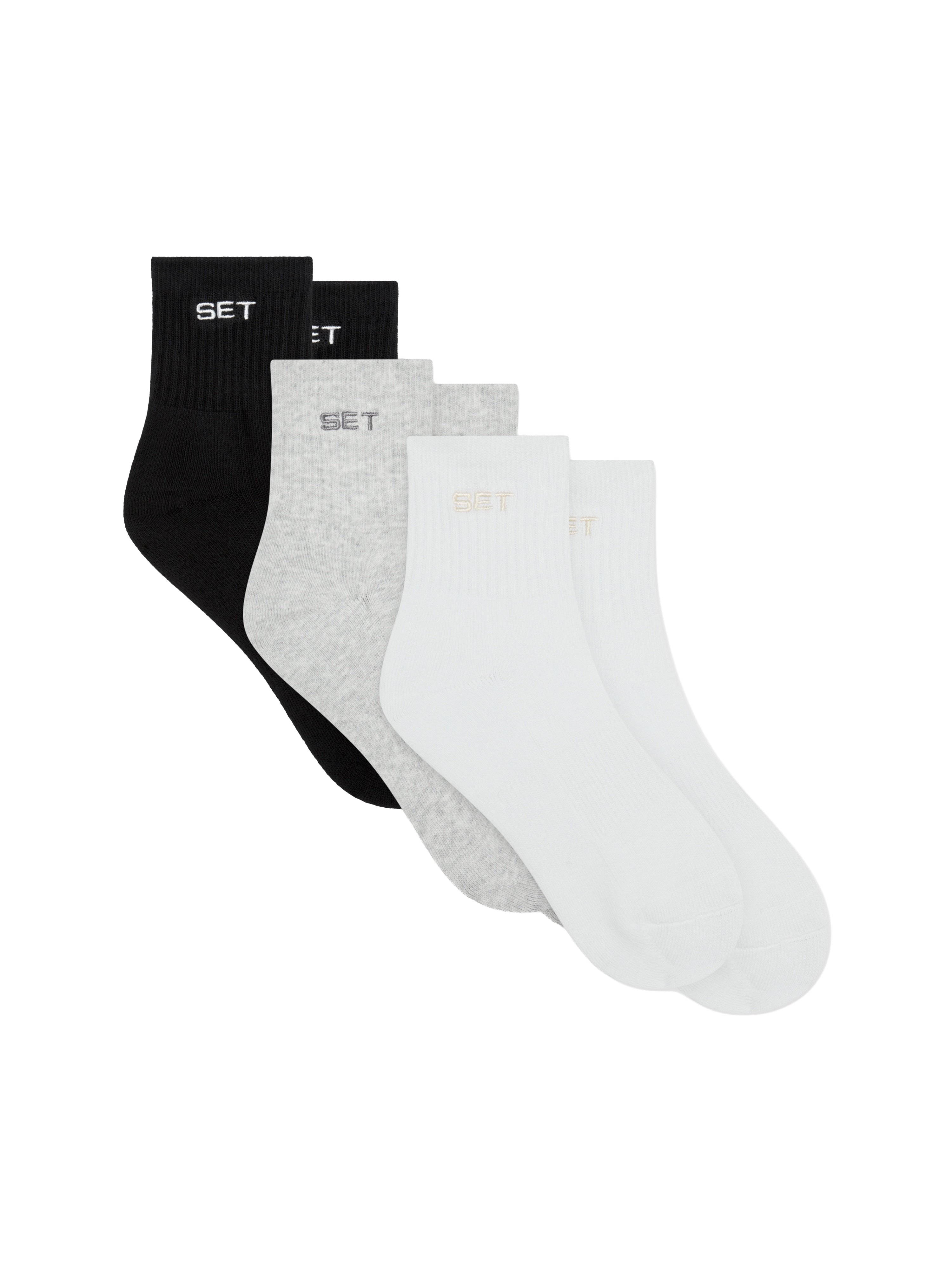 Three-pack of short-ankle socks with SET logo detailing in Blanc, Heather Grey, and Onyx. Everyday comfort. Final sale item.